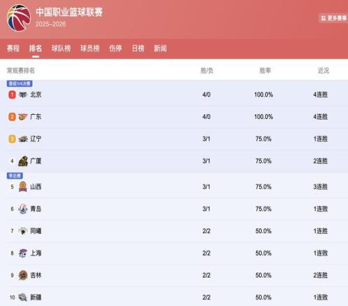广东男篮4连胜飙升至榜二,辽篮爆冷门,北京广厦3队预定四强
